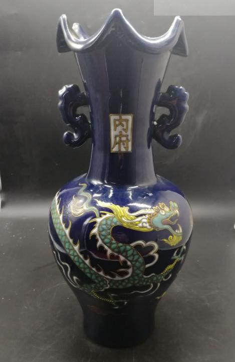 元代官窑瓷 蓝地戗金五色花云龙纹花口瓶