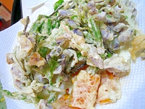 信州裏グルメ情報 山菜の天ぷら コゴミ ヤマソ わさび葉 もみじ傘 ふきのとう カタクリの花 大町市山菜料理情報